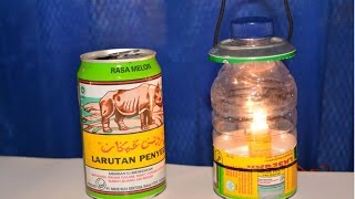 bagaimana cara membuat lentera dari barang bekas bahan yang digunakan adalah kaleng bekas minuman dan botol minuman, lampu dan baterai.